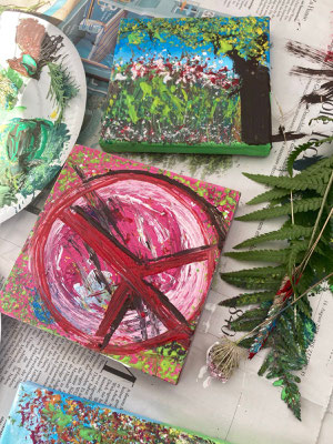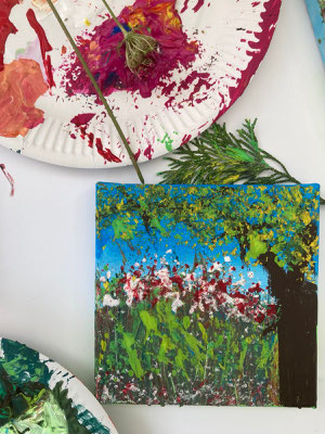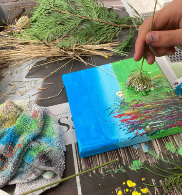 Unter Anleitung von Uta Neubauer gestalten sie eine kleine Leinwand mit Acrylfarben und Pflanzenteilen. Sie nutzen Gräser wie einen Pinsel und drucken Pflanzenstrukturenauf ihr Bild. So entsteht mit einfachen Mittels ein individuelles Kunstwerk, bei dem sie ihrer Fantasie freien Lauf lassen.